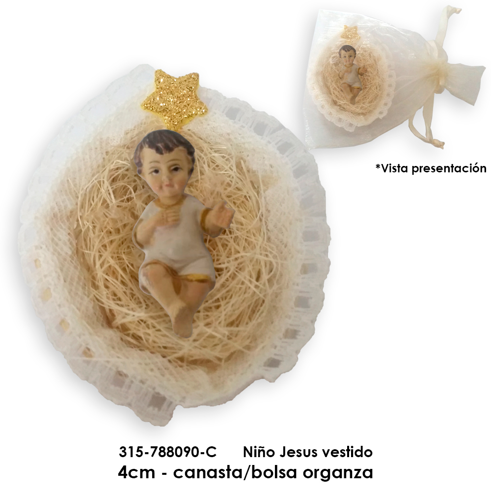 Niño Jesus vestido 4cm - canasta/bolsa organza Niño Jesus vestido 4cm - canasta/bolsa organza
