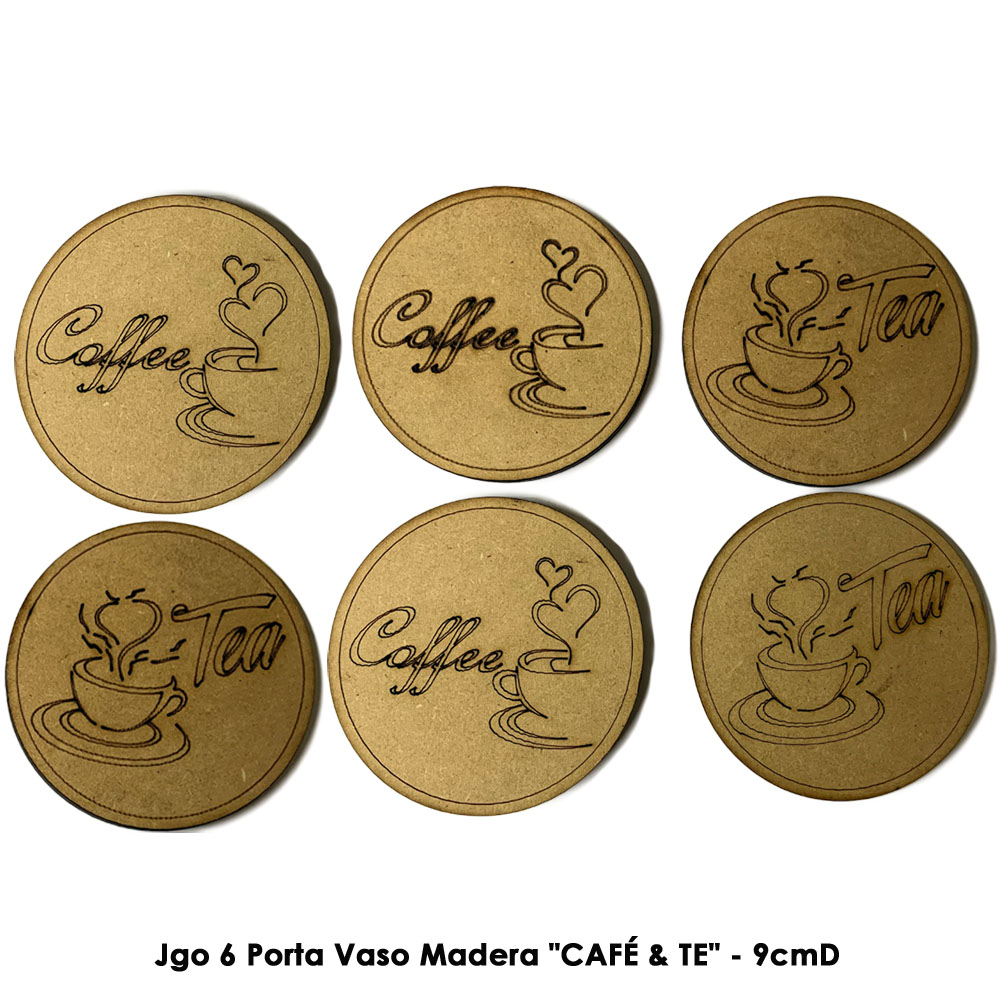Jgo 6 Porta Vaso Madera ''CAFÉ & TE'' - 9cmD Jgo 6 Porta Vaso Madera ''CAFÉ & TE'' - 9cmD